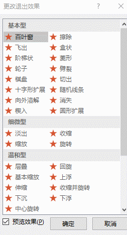 退出动画使用最多的是:擦除、基本缩放、回旋、淡出等