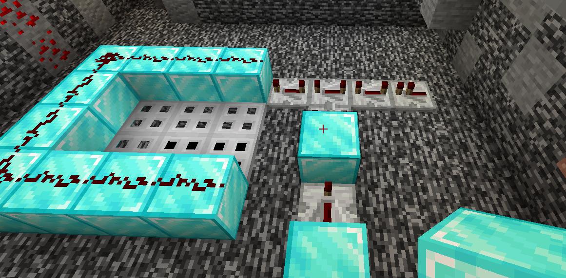 再在钻石块上铺一层红石粉,从长边的一侧延伸出来,放置四个红石中继器,前三个调节到最高档,最后一个不动,在第二个的左边也放置一个最高档的红石中继器。
