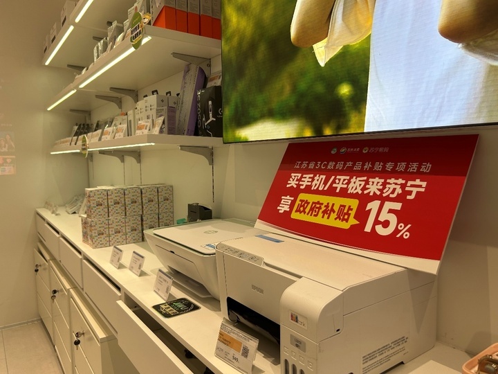 南京华采天地苏宁易购店放置许多“国补”宣传牌。颜颖 摄 不过,也有消费者期盼政策的进一步扩容。1月21日下午,记者来到南京华采天地苏宁易购店,店外大屏和店内“3C”产品展位均放置了大红色的15%“国补”宣传。“春节到了,大家都想换新的数码产品,这两天来咨询‘国补’的客人很多。不过大家期待补贴范围能够进一步扩大。”销售人员黄康告诉记者,相比较去年的补贴政策,今年的类目里缺少了“耳机”类,让原本有购买计划的消费者望而却步。“有人去年看到15%补贴,还在观望,认为今年可能更大力度,结果没有了,有点失望。我自己也想买个新款的苹果耳机,但这也不是刚需,还是再等等。”