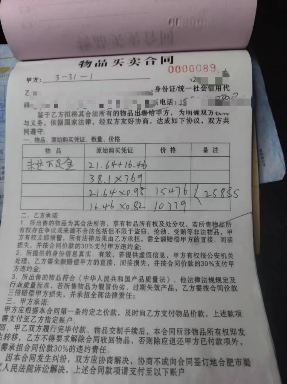 然而在结算时,买方的物品买卖合同上,物品一栏写了未达万足金,在原始购买凭证一栏,21.64克重镯子的重量被乘以一个0.93的系数,16.46克重的项链被乘以一个0.82的系数,虽然收购的金价显示的是769元,但乘以系数之后,2个物品加起来的重量约为33.6克左右,比之前称重的少了约5克。合同显示,最终交易额为25835元,折算下来,38.05克黄金每克售价约为680元左右。