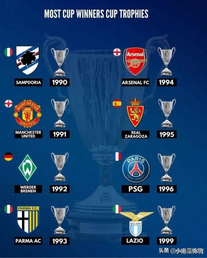优胜杯冠军排行榜:意大利的桑普(1990年)、英格兰的曼联(1991年)、德国的不莱梅(1992年)、意大利的帕尔马(1993年)、英格兰的阿森纳(1994年)、西班牙的萨拉戈萨(1995年)、法国的巴黎圣日耳曼(1996年)、意大利的拉齐奥(1999年)