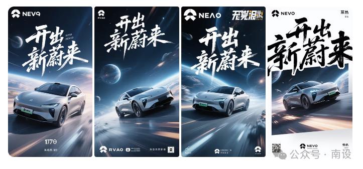 不同的场景中,汽车展示对效果也会有很大差异,例如在森林中,蔚来汽车海报,电影质感,科幻风格,微型森林中飞驰,杂志排版,手写书法字体“开出新蔚来”。