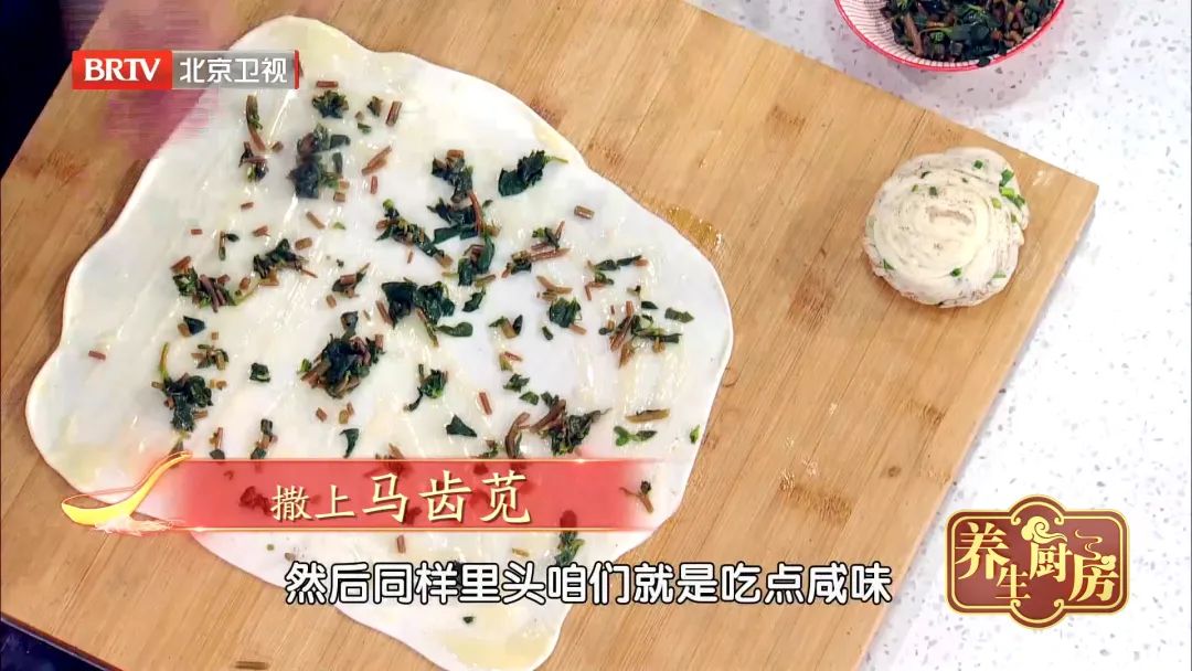 300克面粉、3克盐、180克温热水和成半发面面团,加入50克熟油揉搓后饧发30分钟。面团擀成圆面片,然后将油酥、五香粉、葱花均匀撒在面片上。也可以将马齿苋焯水切碎撒在面片上,做两种馅料的手抓饼。