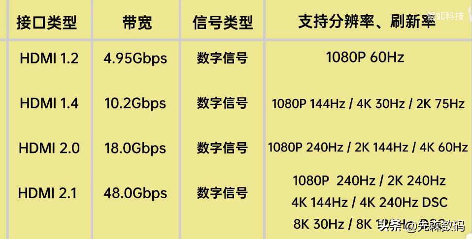 下图是一些博主整理的HDMI发展更新的具体提升,目前主流的都是2.0,只有一些高端产品会采用最新的HDMI2.1(显卡、显示器、电视等)。大家记住一点就好:2.0最高支持4K 60Hz,而2.1已经支持8K 120Hz了,所以想要兼顾高刷和4K以上的体验,那就得2.1.