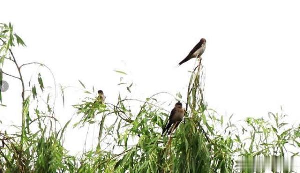 在柳树枝头,有不少金腰燕停歇,仔细一看,它们还是幼鸟。在林中低飞穿梭的,不少是亲鸟。