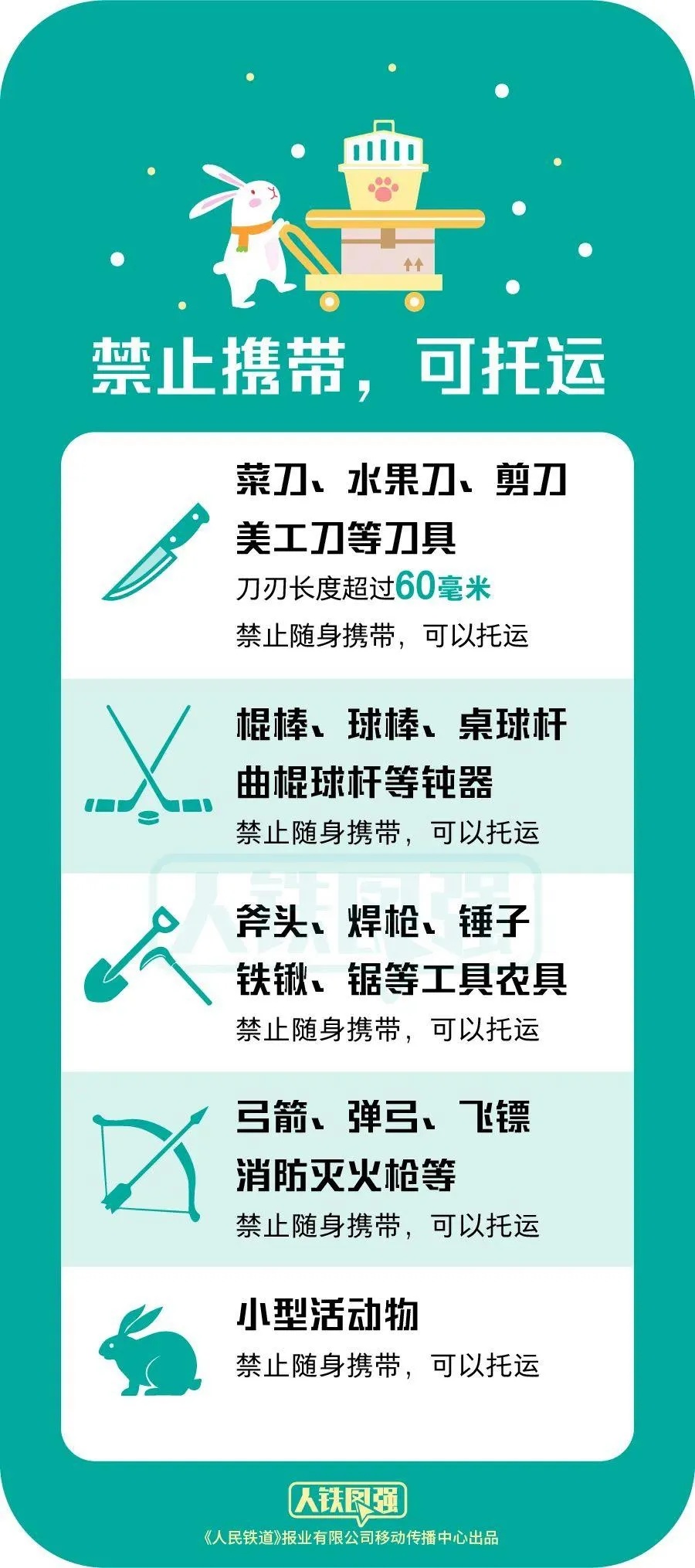 在2022年7月1日起施行的《铁路旅客禁止、 限制携带和托运物品目录》中,主要分为3大种类:禁止托运和随身携带的物品、禁止随身携带但可以托运的物品、限制随身携带的物品。