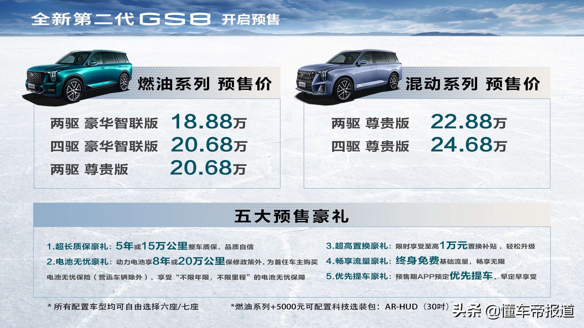 [懂车帝原创 产品] 日前,我们从官方获悉,广汽传祺第二代GS8将会在12月正式上市,新车此前在10月1日公布了燃油版和双擎版车型的预售价,其中燃油版预售价区间为18.88万-20.68万元,混动版车型预售价区间为22.88万-24.68万元。不过由于官方只公布了共计5款车型的预售价区间,但实际上新车上市时将推出7款车型,燃油版和双擎版各相比预售时增加1款车型。