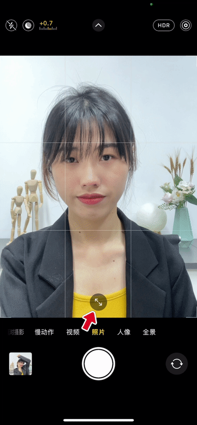 如果自拍时,觉得头大的话,可以点击拍照界面中的缩小功能,人物居中拍摄,显得脸小又自然。
