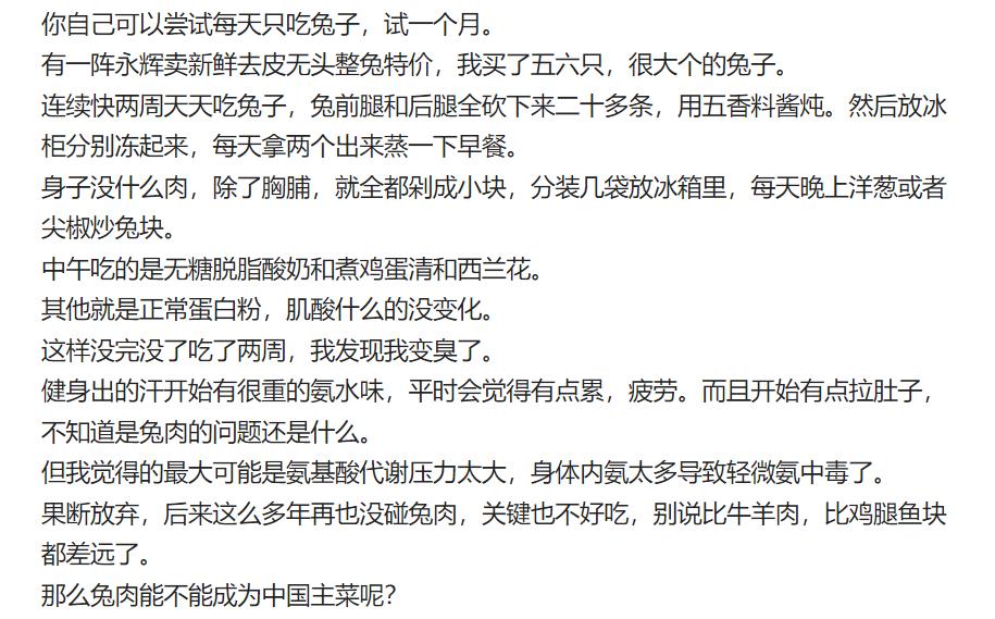 还有一些人表示,他曾买了不少兔肉,除了一些无糖酸奶、鸡蛋和西兰花以外,只吃兔肉。先不说在口感上,兔肉远远没有鸡肉鸭肉猪肉牛肉等肉类来得好吃。