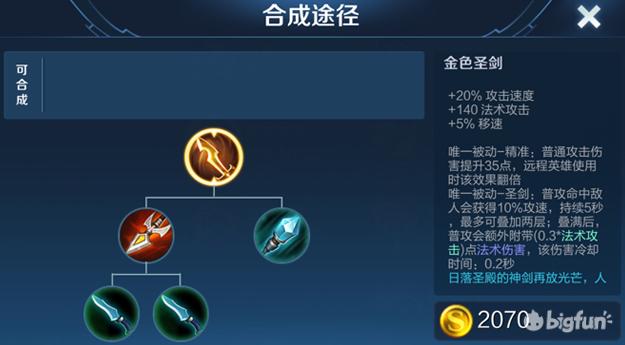 金色圣剑,首先是这件装备的效果,普通攻击命中敌人获得攻速的加成,叠满两层之后会有一个额外的法术攻击加成,这件装备的出彩点就是攻速加成和额外的法伤,这件装备主要针对的法师应该是芈月和扁鹊