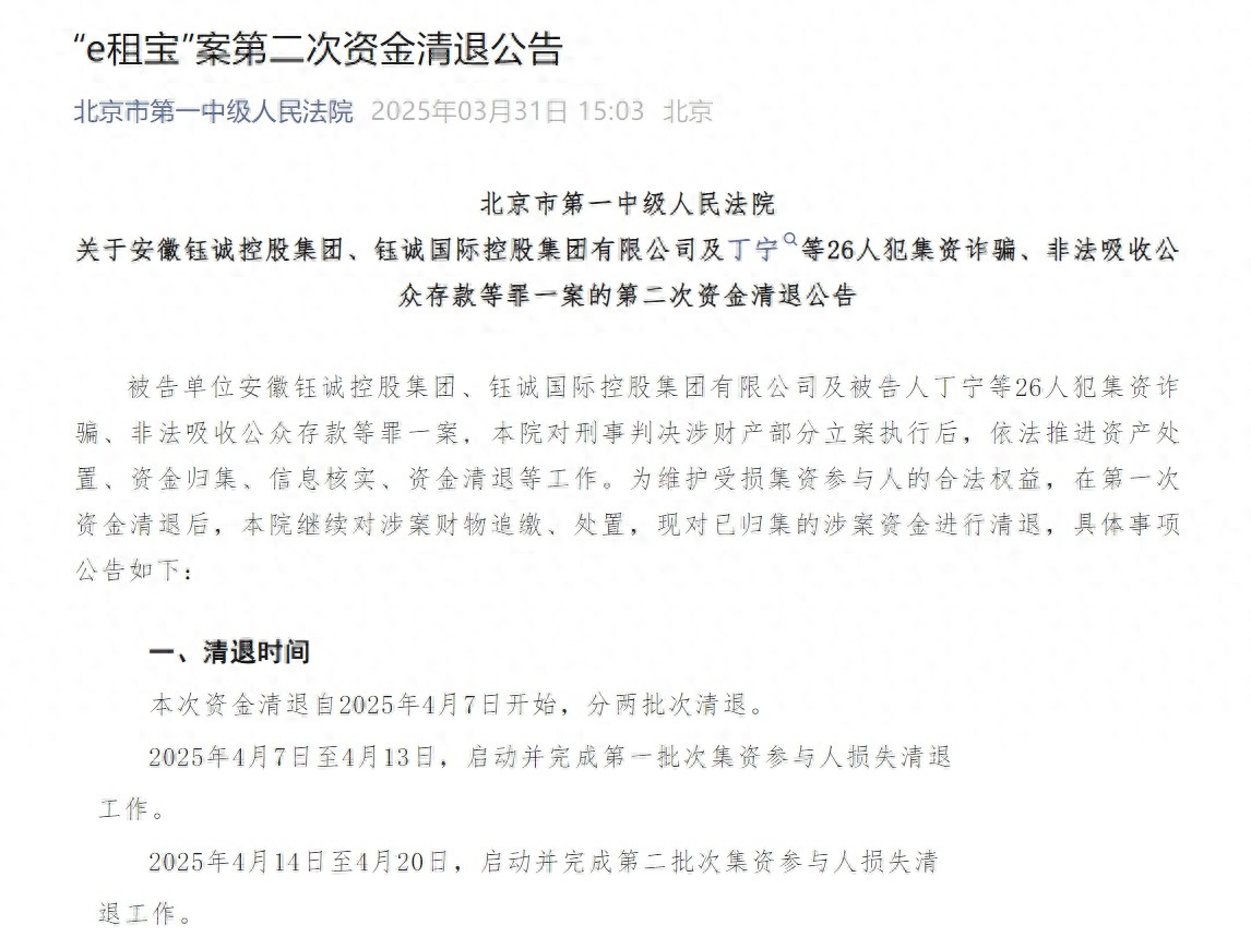 “e租宝”案第二次资金清退公告。图/公告页面截图