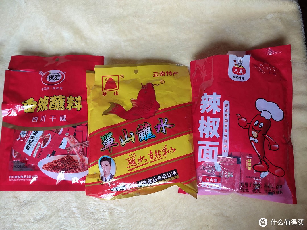 我买的分别是翠宏香辣碟(香辣口味)、单山蘸水(微辣)、六婆辣椒面(无选择)。
