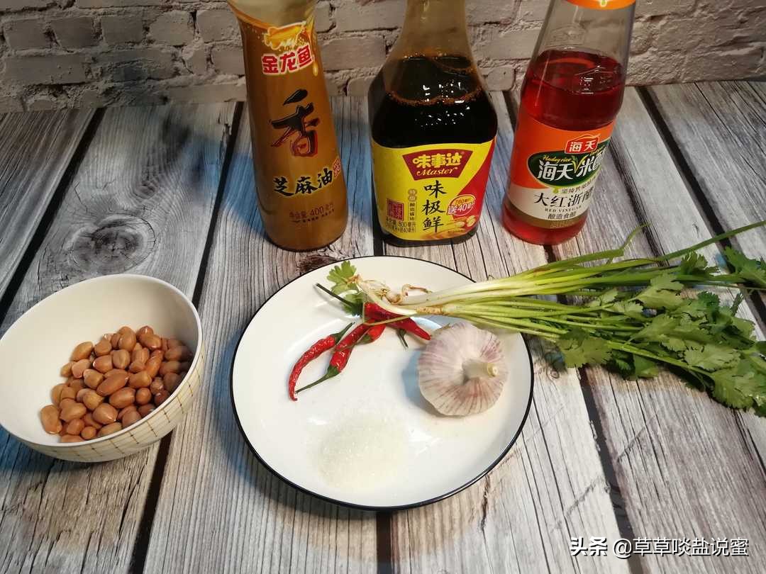 大红浙醋、生抽、芝麻油、白砂糖、花生米、辣椒米、蒜泥、小葱、芫荽等。