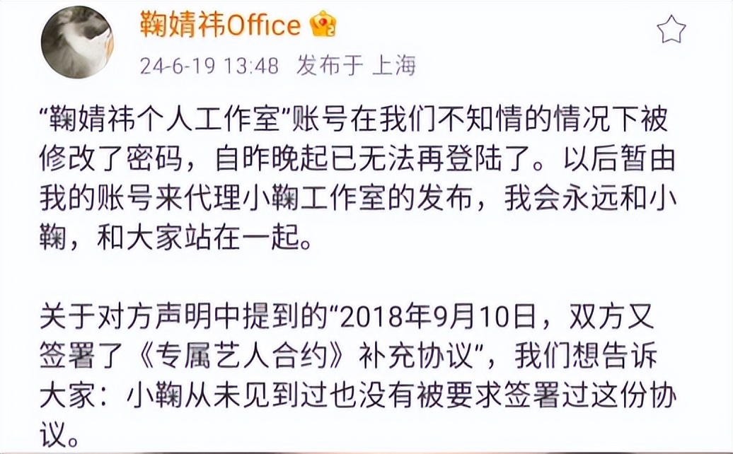 甚至原来是鞠婧祎助理号的@鞠婧祎office都发文,表示公司连鞠婧祎个人工作室的账号都收回去了。