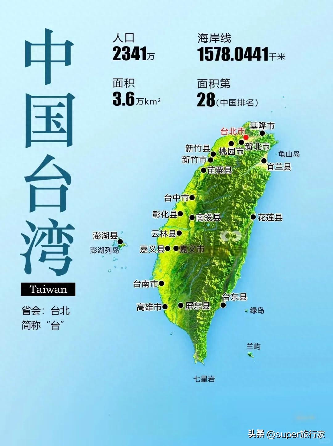 中国台湾,位于中国东南沿海的大陆架上,东临太平洋,西隔台湾海峡与福建省相望,北濒东海,南界巴士海峡与菲律宾群岛相对,陆地总面积 3.6 万平方千米,省会台北市。