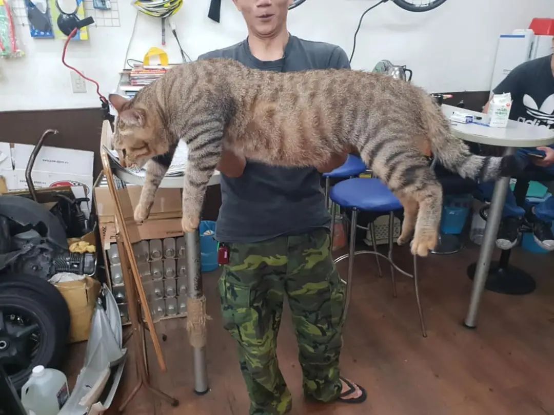 平时吃的东西都是差不多,也没有什么特别的照顾,可其中的一只猫咪体型却越长越大,现在已经快30斤了,身长也接近一米,特别是主人抱起来的时候……远看仿佛抱着一只豹子!