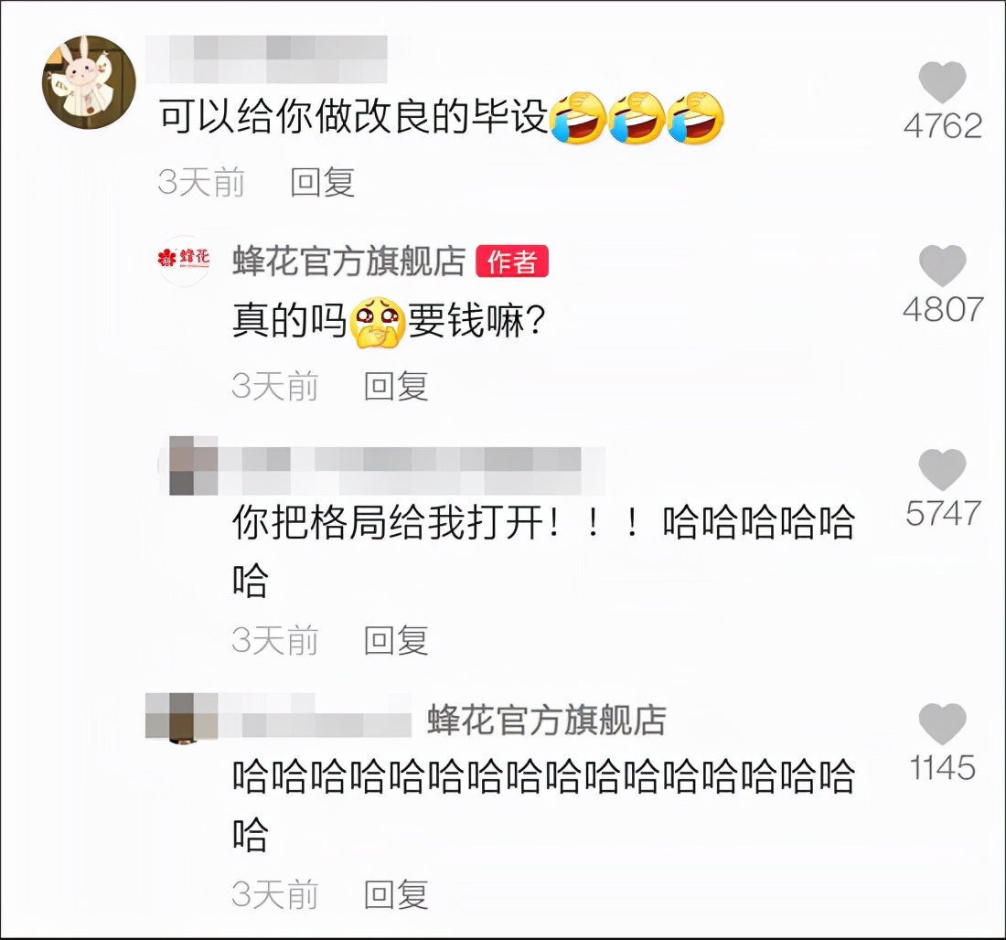 有粉丝表示自己的毕业设计要给蜂花的包装做改良,蜂花的反应依旧是:“真的吗?要钱吗?”
