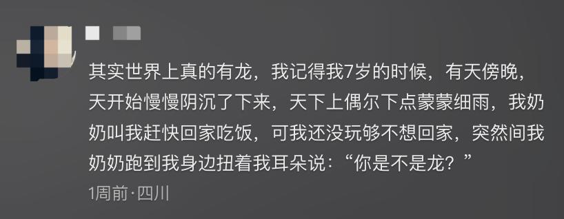 你也能在见龙故事中,看到大量诸如幼年见过无法解释之物,直到中年还是心病一桩的真诚分享。