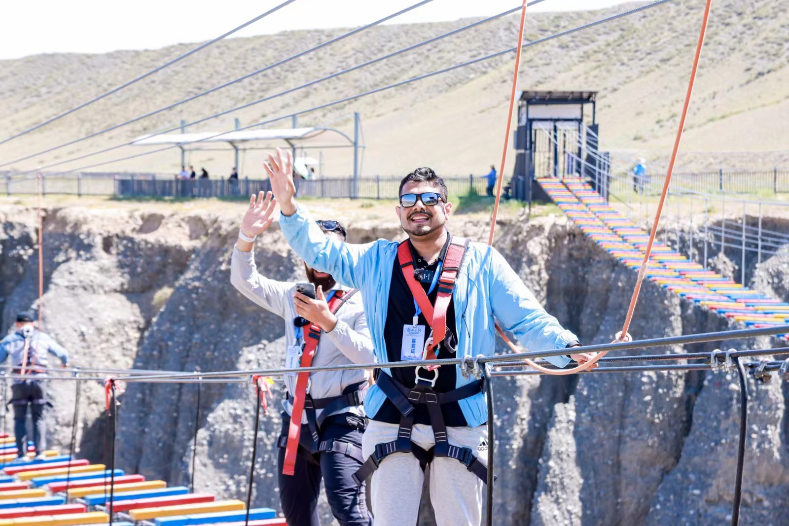 2023年7月,周凯比在新疆克拉玛依市独山子大峡谷体验空中栈桥,感受当地风貌