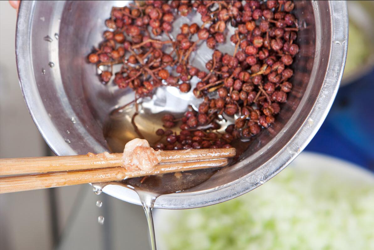 1、首先准备好猪肉末,我们把猪肉末放到碗里,然后加上花椒水,一边倒一边开始搅拌,一直搅拌至上劲为止。
