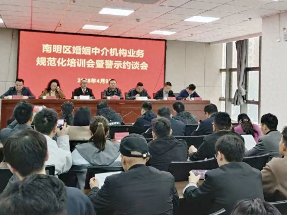 为进一步规范婚介服务市场秩序,全力推动婚介行业实现健康、有序发展,4月9日,南明区委政法委会同区公安分局、区法院、区司法局、区市监局、区民政局、花果园区域街道、派出所以及贵阳市婚姻家庭服务行业协会等13家单位(行业协会),联合举办婚姻中介机构业务规范化培训会暨警示约谈会,花果园区域81家婚恋服务机构参会。