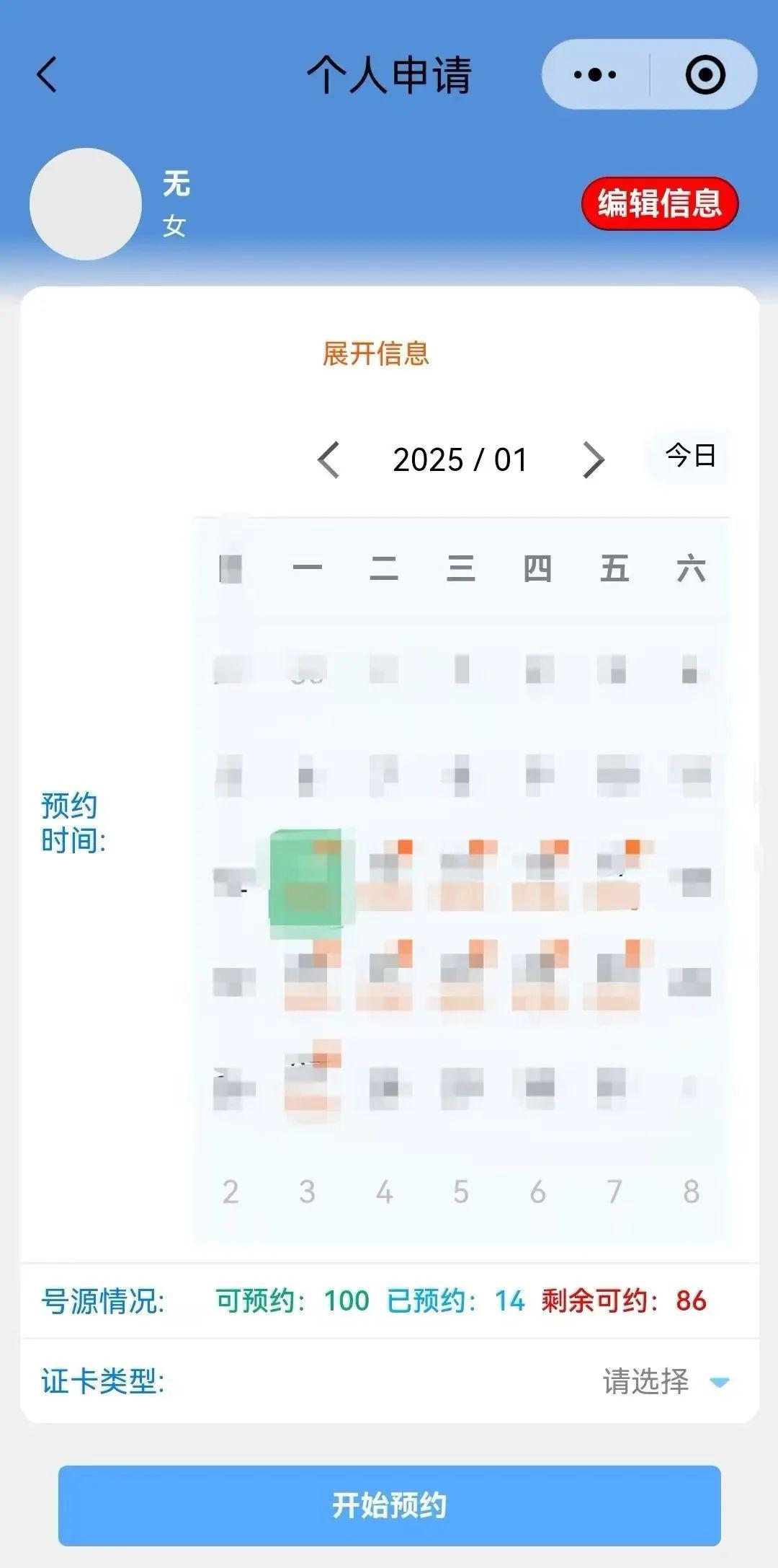编辑个人信息,选择可约日期,选择证卡类型后,