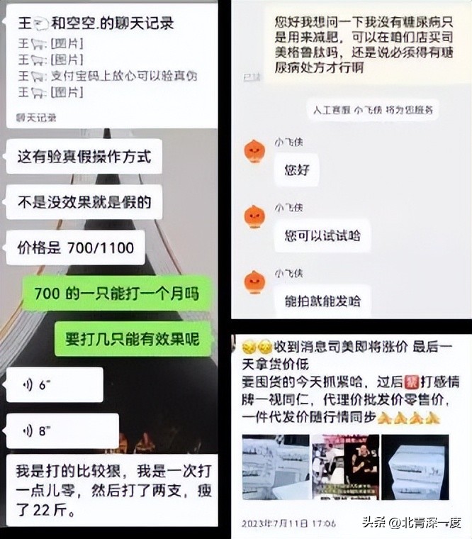 经过了解,这些人卖的减肥针就是GLP-1类降糖药,大多是周制剂的司美格鲁肽。深一度记者从私信中加了两个微信,一个是医美机构工作者,一个是药代。秒通过好友申请后,不等记者发问,他们就发来了一个“汇总答疑”,包括怎么验针剂的真伪、怎么使用。