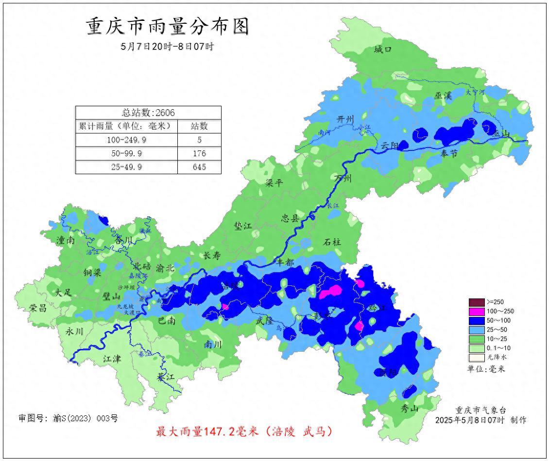 天气实况显示,7日07时—8日07时,我市白天阴天到多云,夜间各地阵雨或雷雨,强降雨主要位于中部和东南部地区,雨量大到暴雨,局地大暴雨。涪陵、彭水、黔江等3个区县的5个雨量站达大暴雨,江北、南岸、巴南、合川、南川、涪陵、丰都、云阳、奉节、巫山、武隆、彭水、石柱、黔江、酉阳、秀山等16个区县的176个雨量站暴雨;最大雨量147.2毫米(涪陵武马),最大小时雨量43.8毫米(彭水棣棠,8 日 02 时)。大渡口、江津、南川、涪陵、丰都、梁平、万州、开州、云阳、奉节、城口、巫溪、巫山、武隆、黔江、酉阳、万盛经开区等17个区县局地出现6~7级阵风。气温13~33℃。
