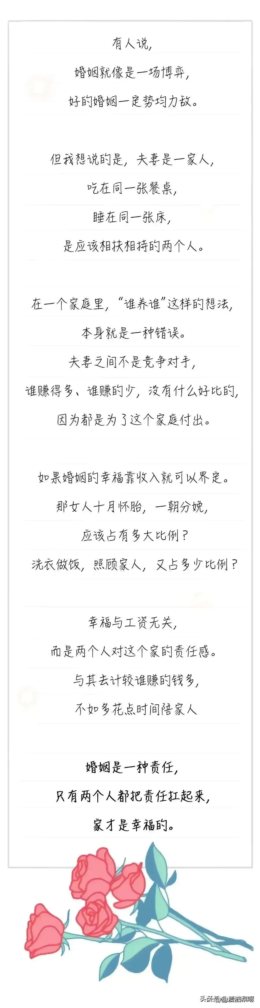 夫妻双方不管主内还是主外,都是在为这个家庭而奋斗,没有一个人是轻松的,互相理解,互相帮助,才能维系好婚姻。