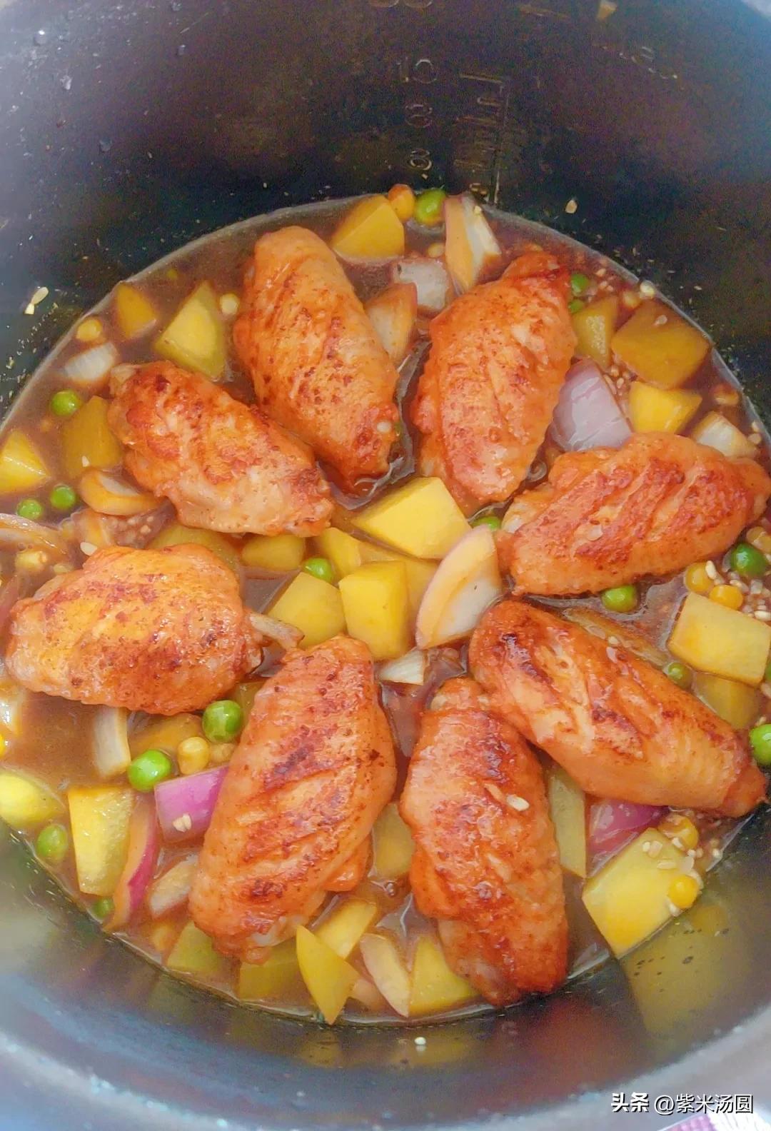 食材:鸡翅8个,土豆一个,豌豆小半碗,玉米粒小半碗,洋葱半个,葱姜少许