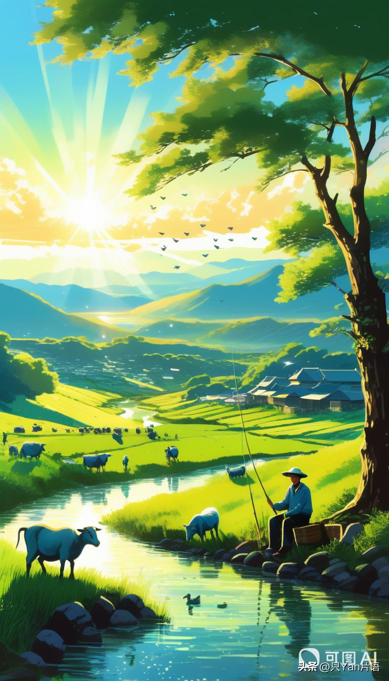 图2:翠绿的田野、清澈的小溪、悠闲的牛羊,田间劳作、在河边垂钓