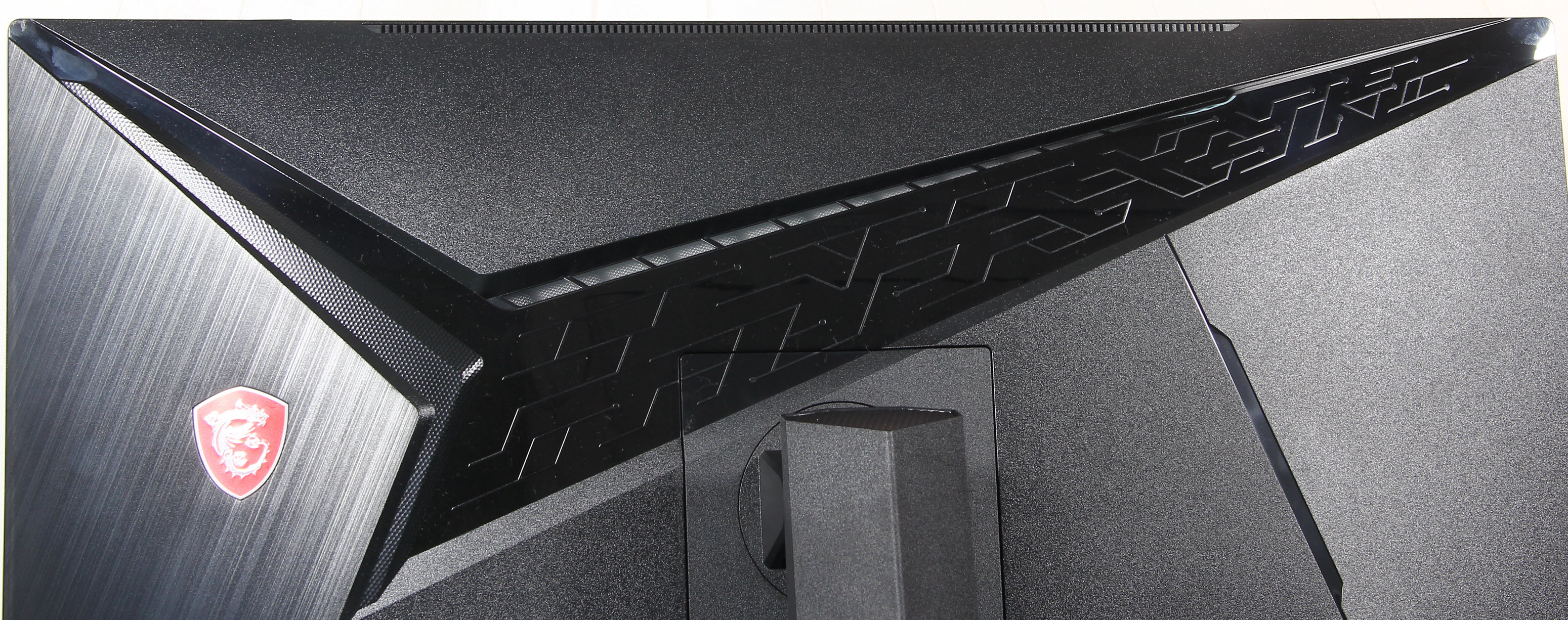 接下来看看背面,微星给274的游戏元素非常到位,背面的中间位置有一大片的镜面部分,表面有回路纹理设计,上部还有RGB灯效,这里看着很赞。另外还有拉丝处理的,很有质感。左侧是微星龙盾LOGO,左下角有一个红色的摇杆,摇杆的表面还有纹路处理,触感细腻。顶部配有散热格栅,用于给显示器内部的元件散热。