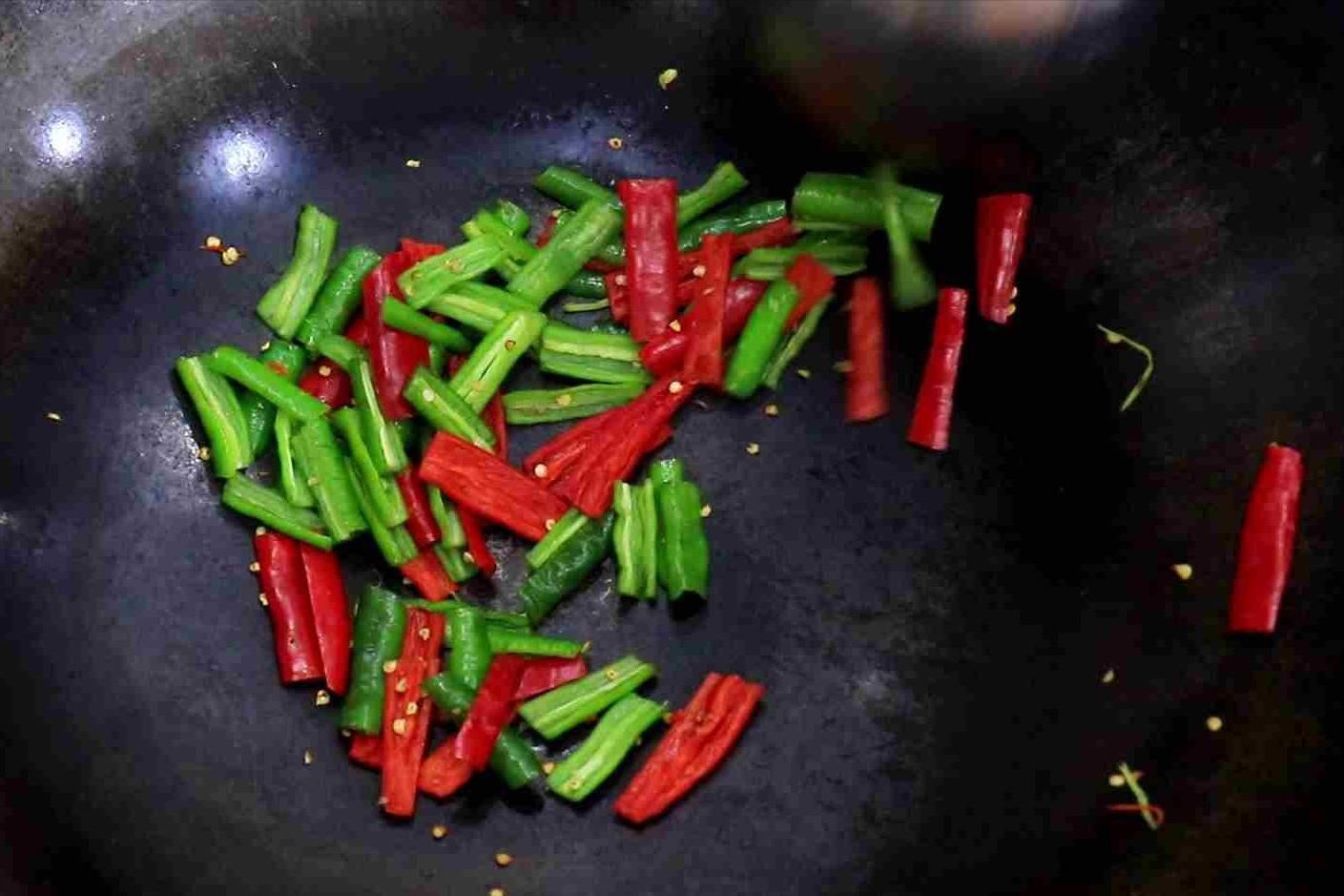 3.把锅烧热、不用放油,直接倒入准备好的青红辣椒开小火煸炒,去除里面的水分,辣椒塌架、闻到浓郁的香辣味以后盛出来备用。