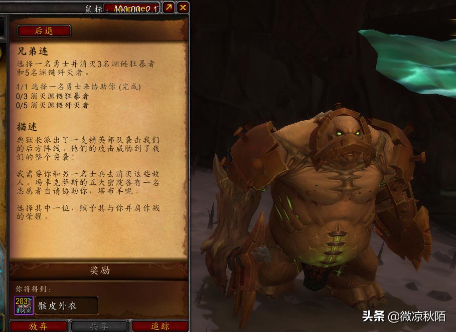 这有个小窍门,可以加快“浴血奋战”的成就进度。整个突袭需要四个任务,在接到所有任务之后,先去完成“携手制定计划”任务,获得“超载的百心长”,这时候选择的随从已经拿到成就进度。然后直接放弃“兄弟连”任务,重新在德拉卡那获取任务,这样就能重新选一个随从,完成下一个突袭任务,拿到进度后继续放弃“兄弟连”任务,一直重复下去,那么就能一次突袭拿到三个随从的成就进度。