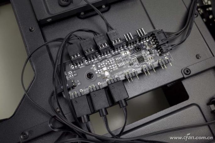 如果细看厂家提供的效果示意图还会发现一个问题,安装了了8~9把风扇(顶部风扇为选装)的机箱里,并没有纵横交错的风扇电源线,这是因为机箱在背部走线区域提供了一个灯效+风扇控制器,尽量让这些线缆从风扇出来就进背部,这样不仅整洁了很多,也有利于散热,当然安装整理也更方便了。