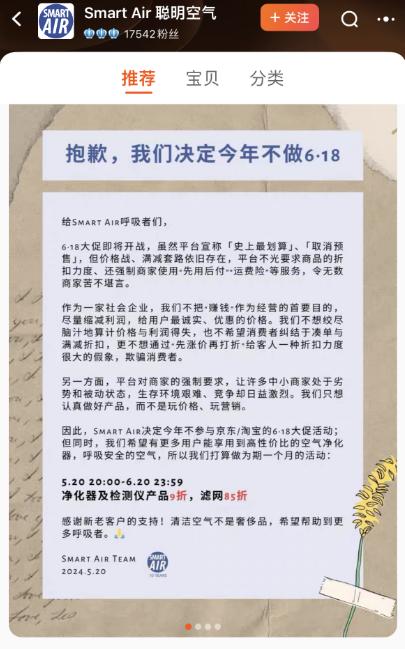“抱歉,我们决定今年不做‘618’。”空气净化器品牌“Smart Air聪明空气”在店铺挂出的声明中称大促价格战、满减套路仍存,平台不光要求商品的折扣力度,还强制商家使用“先用后付”“运费险”等服务,令商家苦不堪言。品牌不参与电商平台的“618”大促活动。此前也有宠物用品商家告诉记者,大促活动的优惠由商家承担,给商家带来了一定压力。