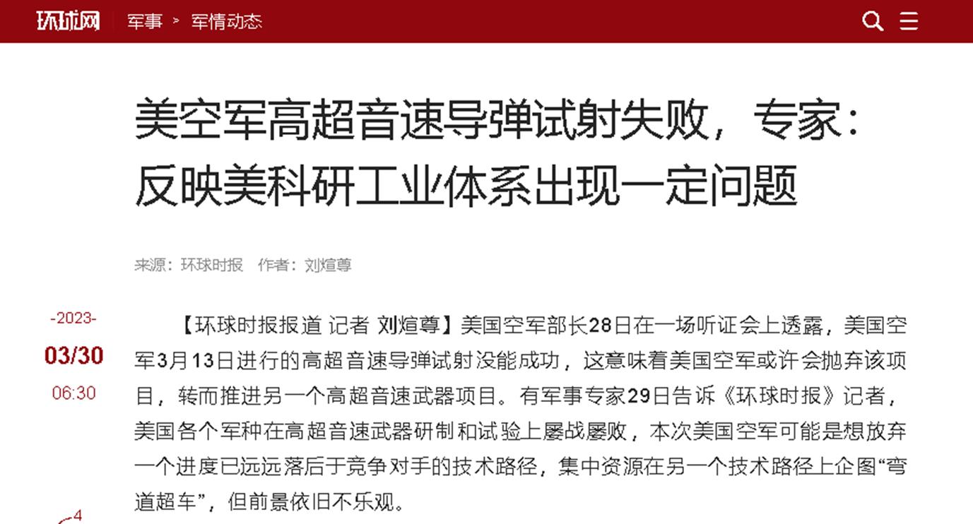 【3】环球时报——美空军高超音速导弹试射失败,专家:反映美科研工业体系出现一定问题