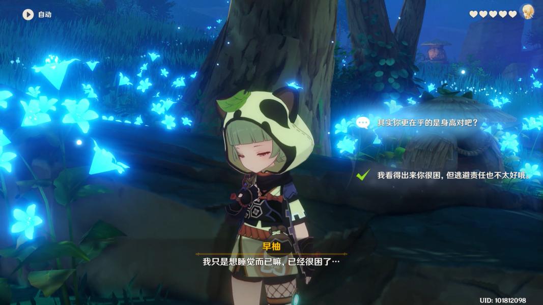 来到镇守之森,与早柚对话,选择【我看得出你很困,但逃避责任也不太好哦。】