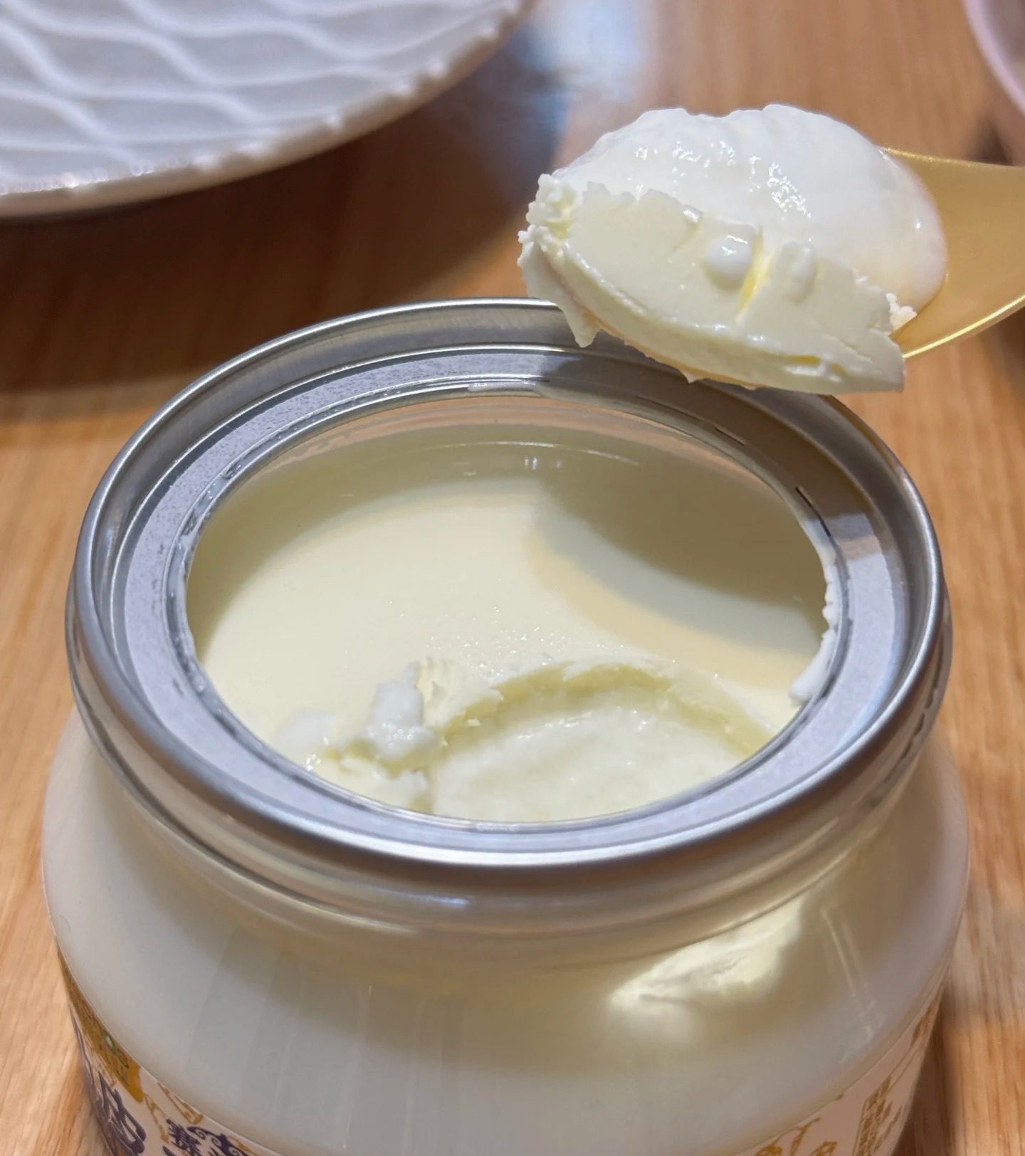 它的顶部有一层厚厚的淡黄色奶皮