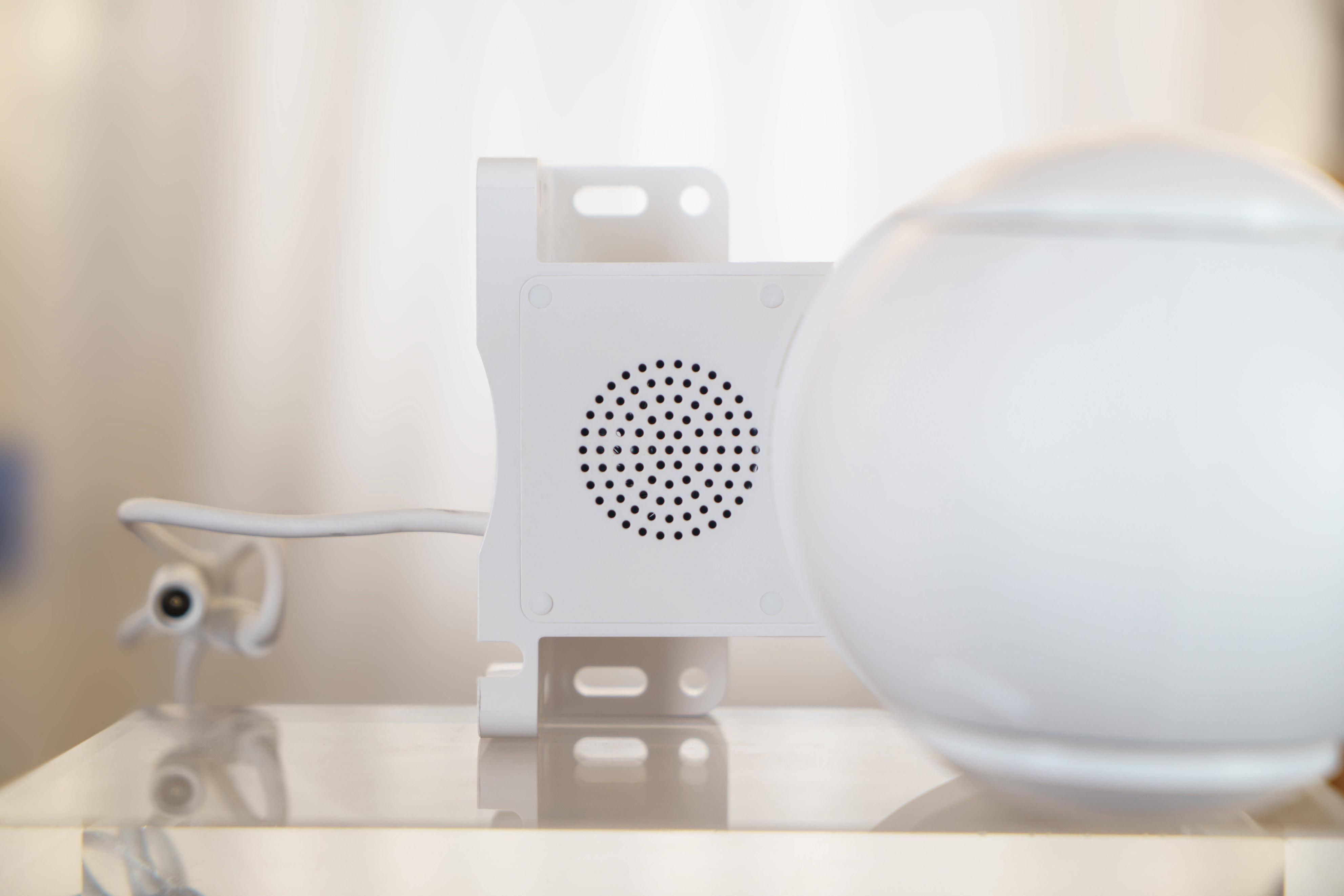 ▼中间这颗球就是它的影像部分,可以拍摄的最大分辨率为2280*1620,并且拥有F1.6的大光圈,进光量更多,暗光环境下的信噪比更高;顶上第一个小孔是状态指示灯,第二个小孔是麦克风开孔,中间就是镜头,最底下是补光灯模组,左右两侧白色的是红外补光灯,夹在中间黄色的是LED白光补光灯