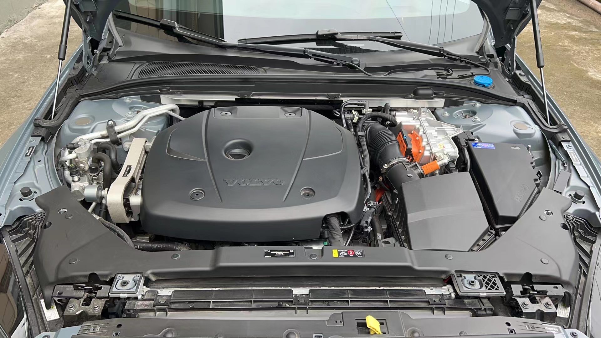 T8车型打开机舱后会发现明显的高压组件(橙色部分)