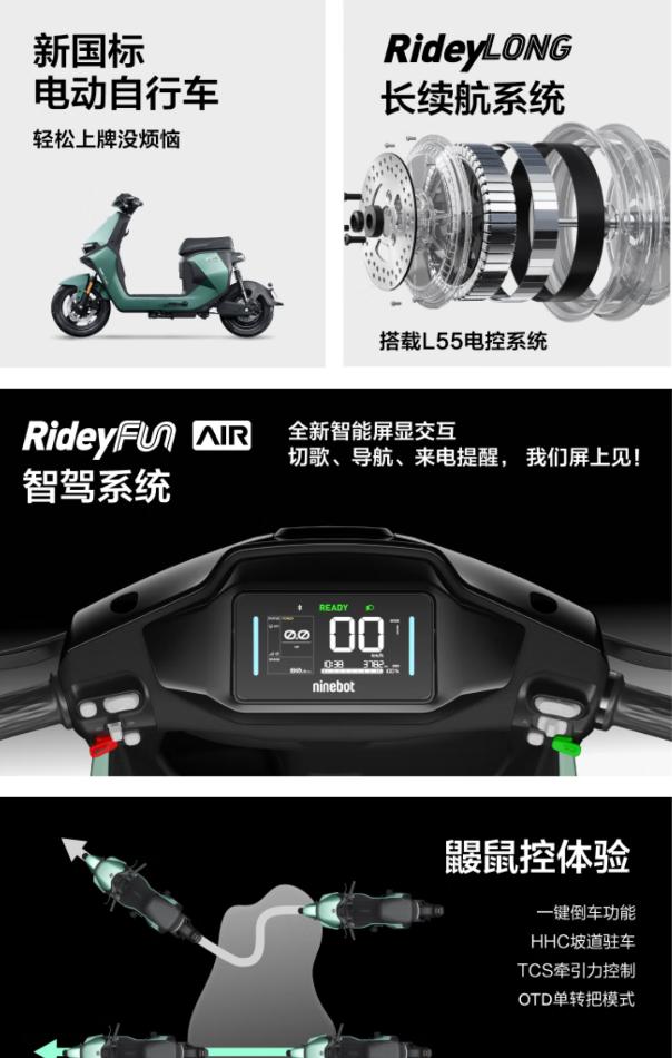 除了车架本身的稳定,九号Mz MIX电动还有摩托车级轮胎,双碟刹等配置,支持如鼹鼠控功能即(TCS 牵引力控制系统,坡道驻车功能、OTD单转把模式、一键倒车等),极大提升了电动自行车骑行的安全性和便利性,在骑行、倒车以及驻车等功能适合外卖小哥从容应对各场景。