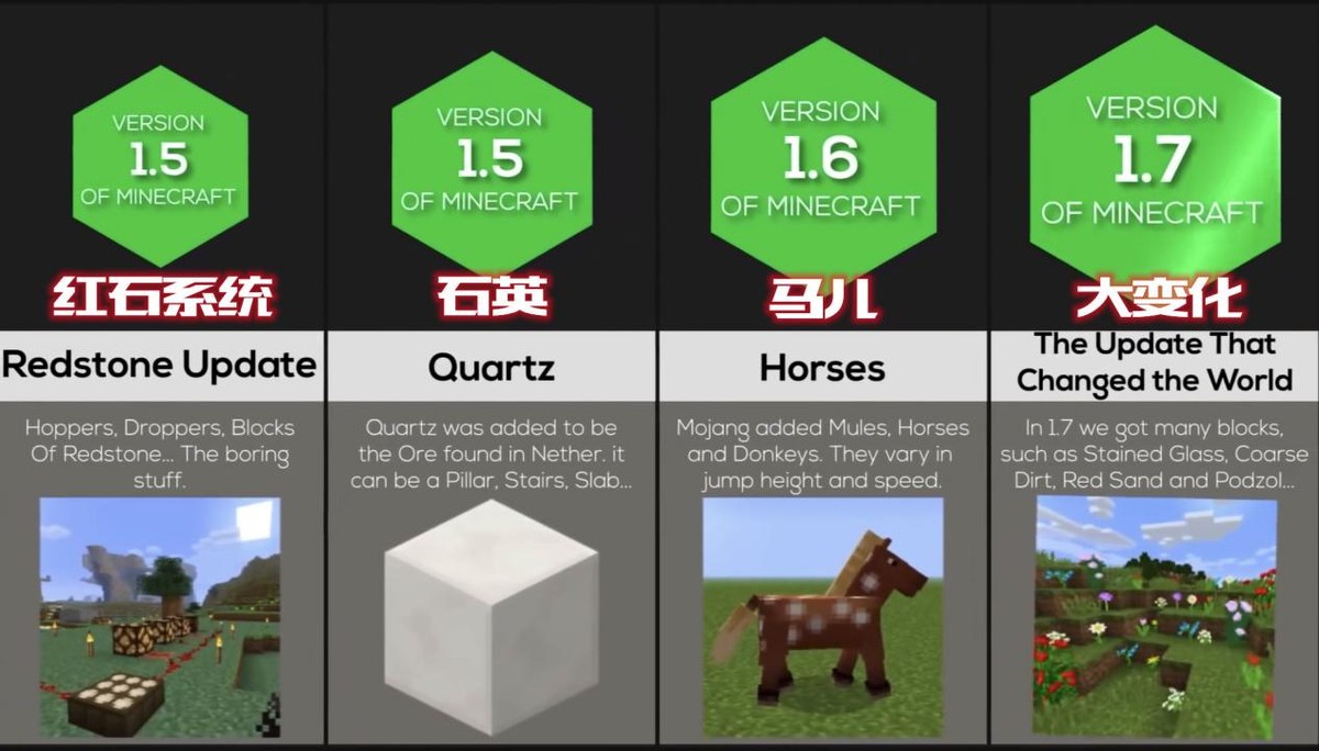 BUFF党狂喜完了,接下来就迎来了科技党和建筑党狂喜的版本了,红石系统和石英都是在1.5版本更新的,很多实用的红石机以及建筑干货,也都是在这个时期,疯狂涌现而出,1.6版本加入了马儿,1.7版本有点像薛定谔的更新,似乎看出更新以后有变化了,但是似乎又没有新加入什么内容,没错,1.7最大的更新,就是丰富了游戏当时的颜色系统啊,方块材质之类的内容。