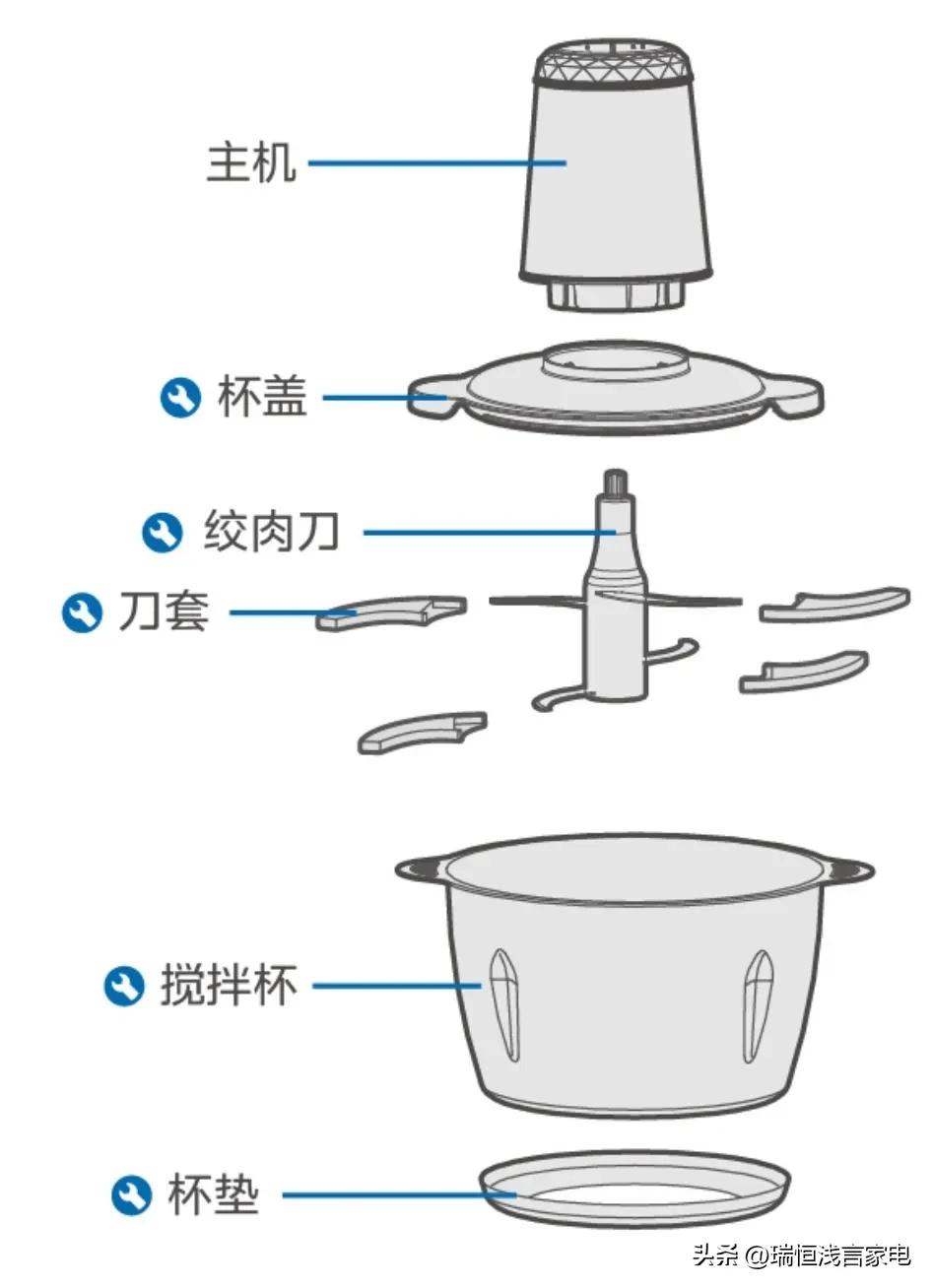 主要由主机(机头),杯盖,绞肉刀,刀套,绞肉杯,杯垫组成。