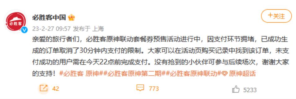 必胜客回应与原神联动系统崩溃:已取消30分钟支付限制