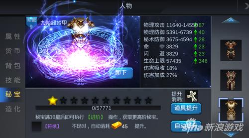 当符纸或古墓火种不足的时候,玩家可以来选择消费金块自动升星或者是进阶(这里小编并不推荐),秘宝等级越高,升星进阶消费的符纸、古墓火种和钞票越多。