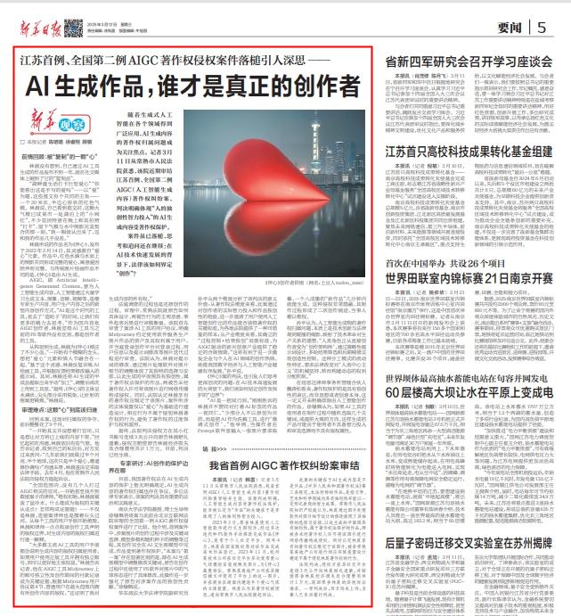 随着生成式人工智能在各个领域得到广泛应用,AI生成内容的著作权归属问题成为关注焦点。常熟市人民法院审结的江苏首例、全国第二例AIGC(人工智能生成内容)著作权纠纷案,判决明确体现“人的独创性智力投入”的AI生成内容受著作权保护。该案受到中央电视台、法治日报、新华日报、苏州日报等多家媒体关注报道。