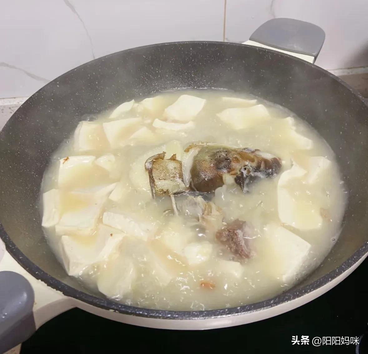 鱼头煎香,加开水,加豆腐大火滚汤,必须是买白色的