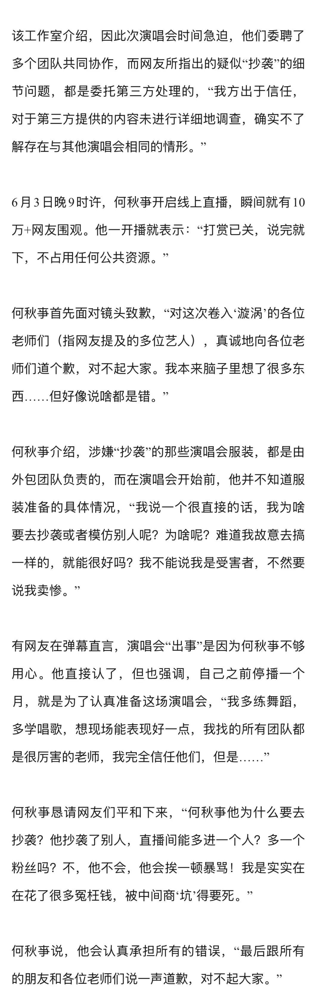 近日,在短视频平台拥有千万粉丝、22岁“网红”何秋亊被指其演唱会有多处创意涉嫌抄袭。继何秋亊工作室6月2日发布声明公开致歉后,6月3日晚,何秋亊本人通过线上直播,对此次“抄袭”风波进行了回应。