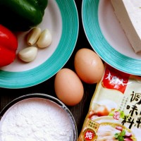 鸡蛋两枚,青红甜椒各10g,蒜三瓣,水200ml,生抽一勺,耗油一勺,肉粉1小勺,淀粉一小勺,普通面粉小半碗,白胡椒粉撒三下